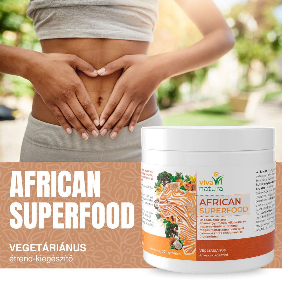 AFRICAN SUPERFOOD Baobab, akáciarost, ananászgyümölcs, kókuszliszt, papayagyümölcs, okinawai korall kalcium és C-vitamin tartalmú étrend-kiegészítő