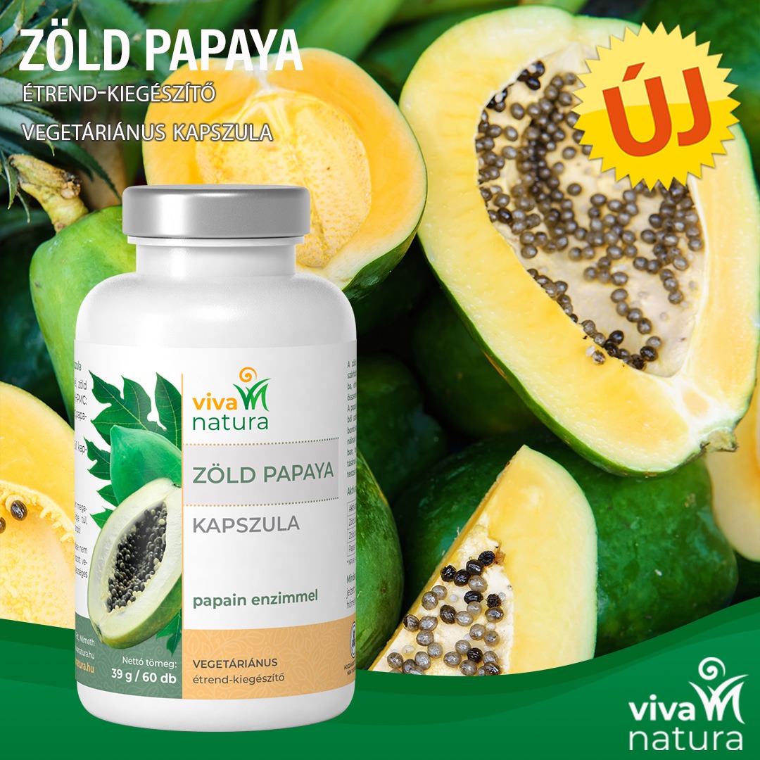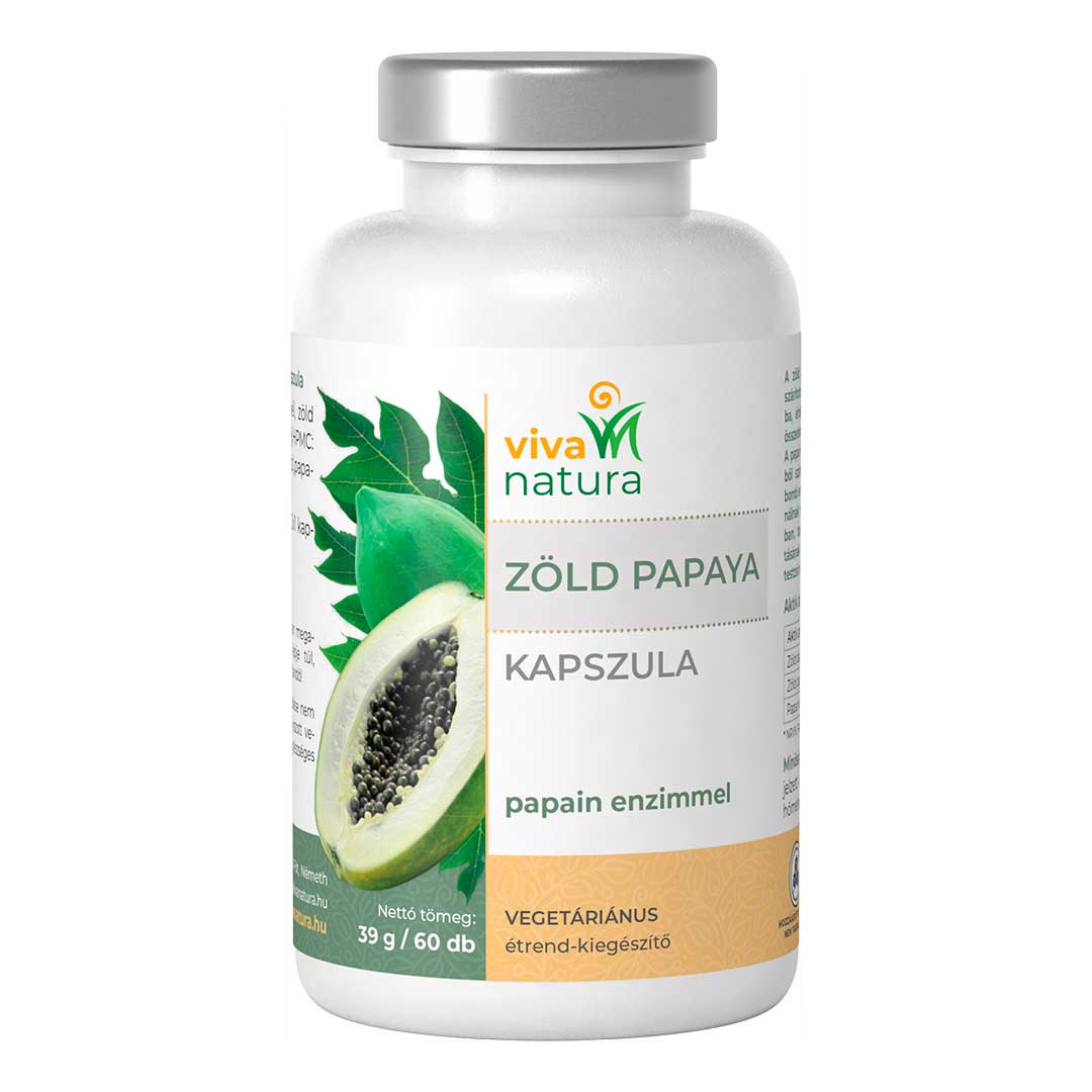 Zöld Papaya papain enzimmel kapszula zöld papaya levelét tartalmazza – és papaya gyümölcspor gondosan szárított és finomra őrölt formában kerül a kapszulába, értékes tápanyagaikkal gazdagítva a termék összetételét.